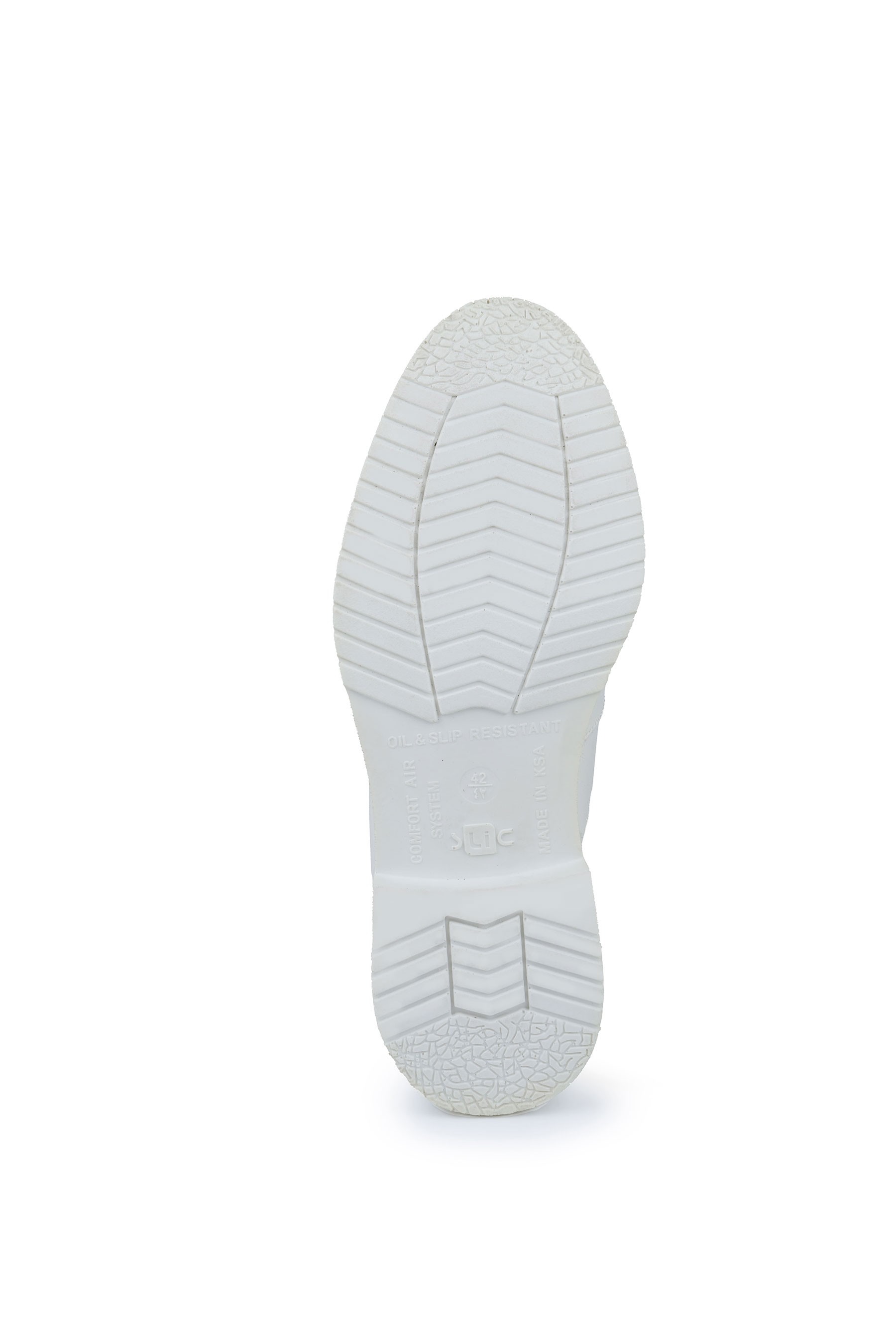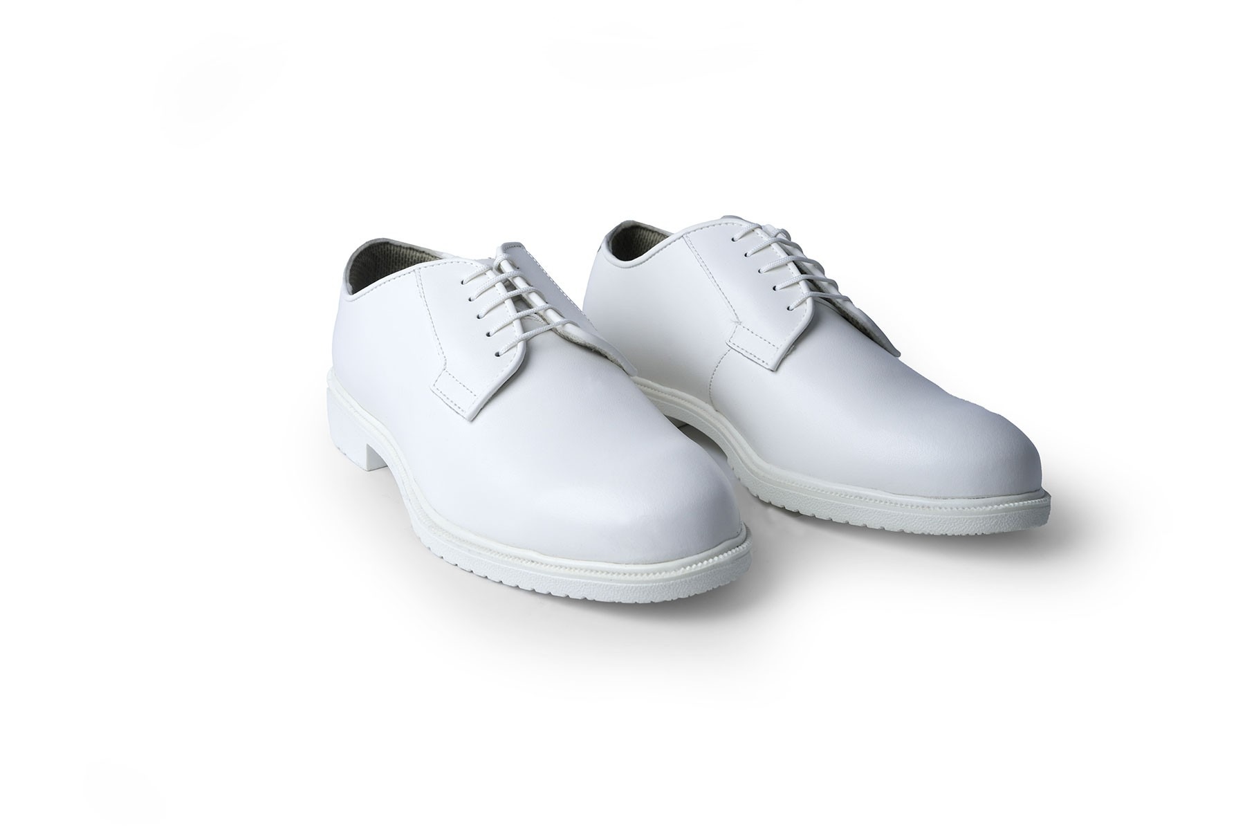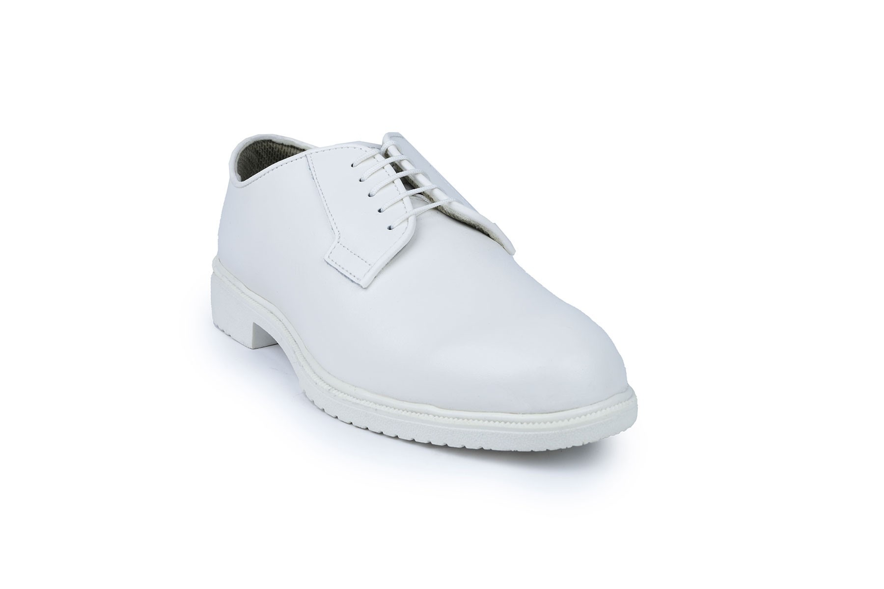 Made from white coated cow leather, these shoes feature five blind rust-resistant eyelets for a sleek, uniform finish. The breathable, anti-microbial treated Cambrelle lining with foam backing ensures lasting comfort and odor control, while the removable foam-backed footbed adds extra cushioning. The flexible single-density PU outsole with heel is engineered for slip and abrasion resistance, making these shoes ideal for environments where safety and style go hand in hand.
